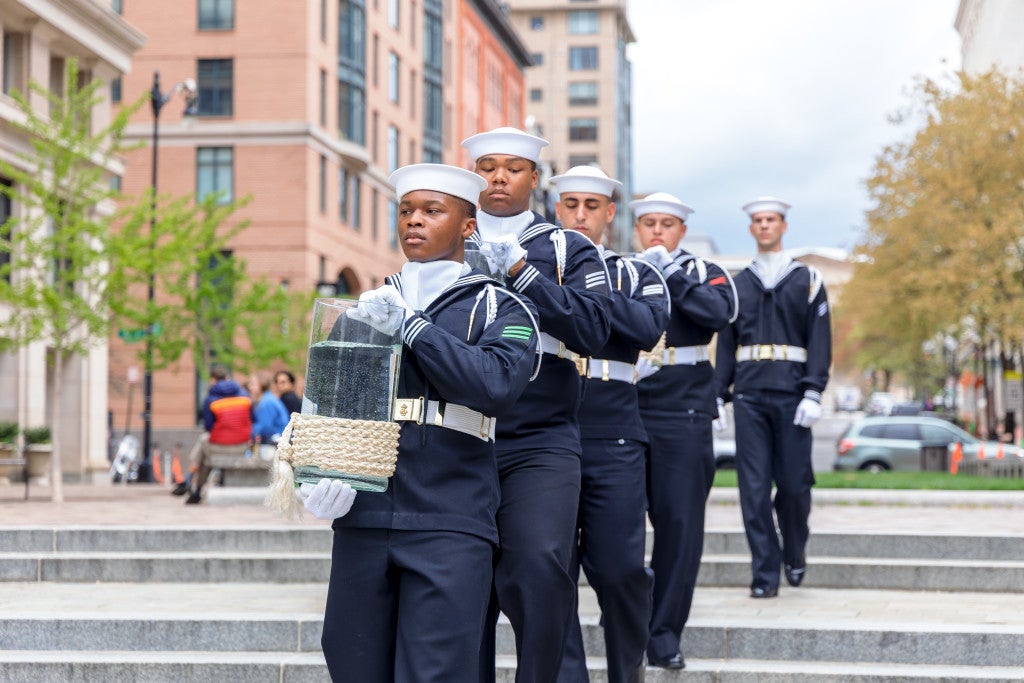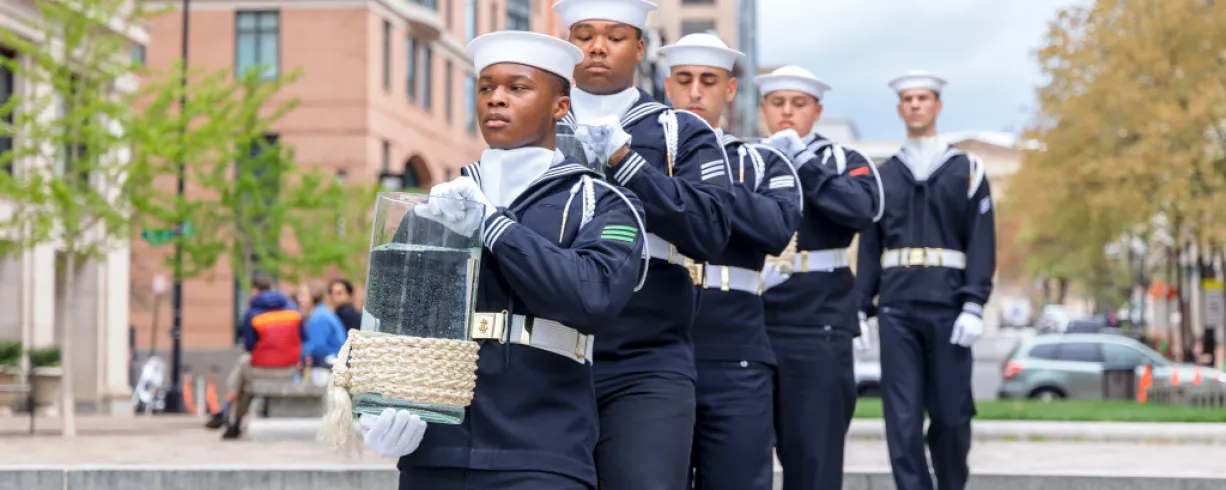 The ceremonys main highlight is when the U.S. Navy Ceremonial Guards pour water from the Seven Seas and Great Lakes into the fountains, symbolically ushering in the spring season.