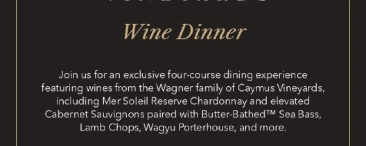 Join us for an exclusive four-course dining experience featuring Caymus Vineyards of Napa Valley.Enj oy the bright Mer Soleil Reserve Chardonnay alongside elevated Cabernet Sauvignons—perfectly paired with Butter-Bathed Sea Bass, Lamb Chops & Wagyu Porterhouse