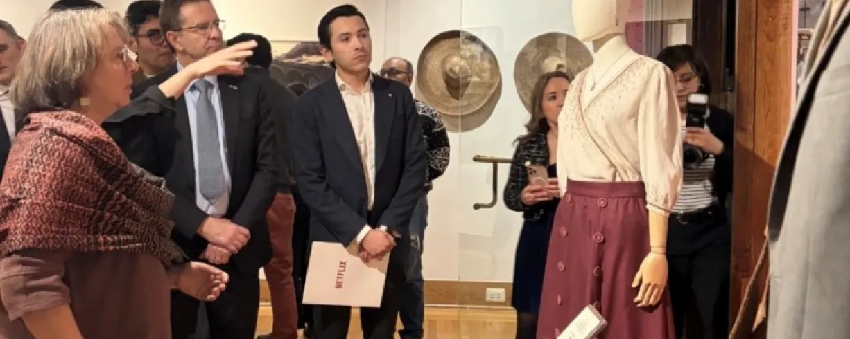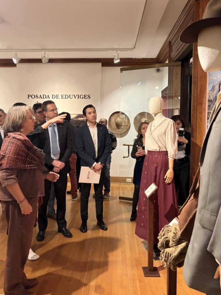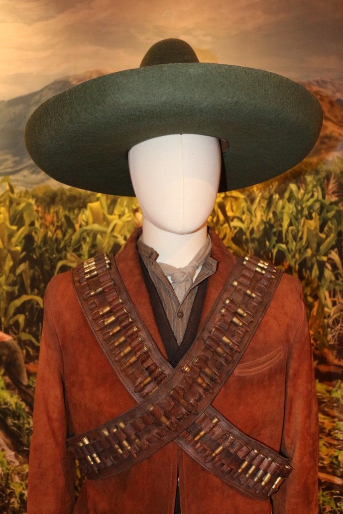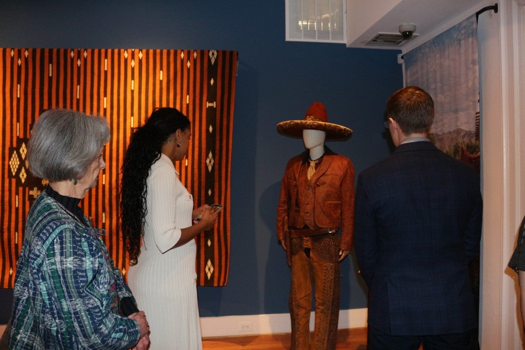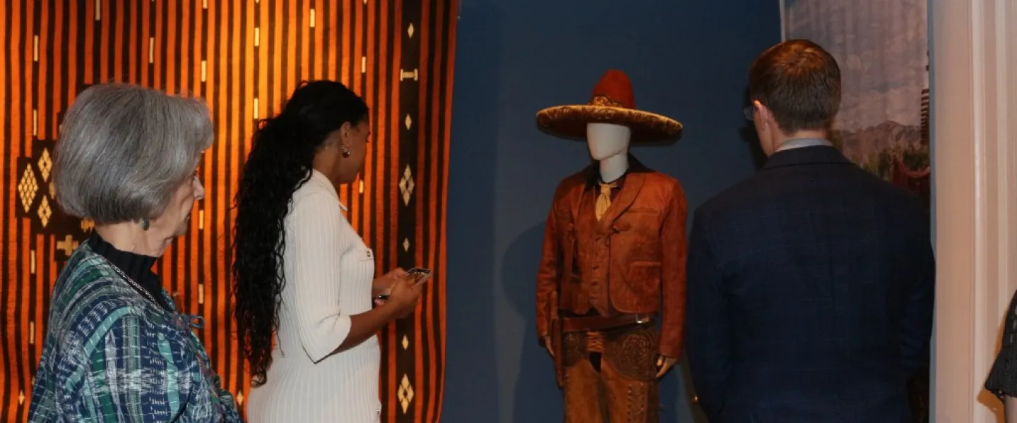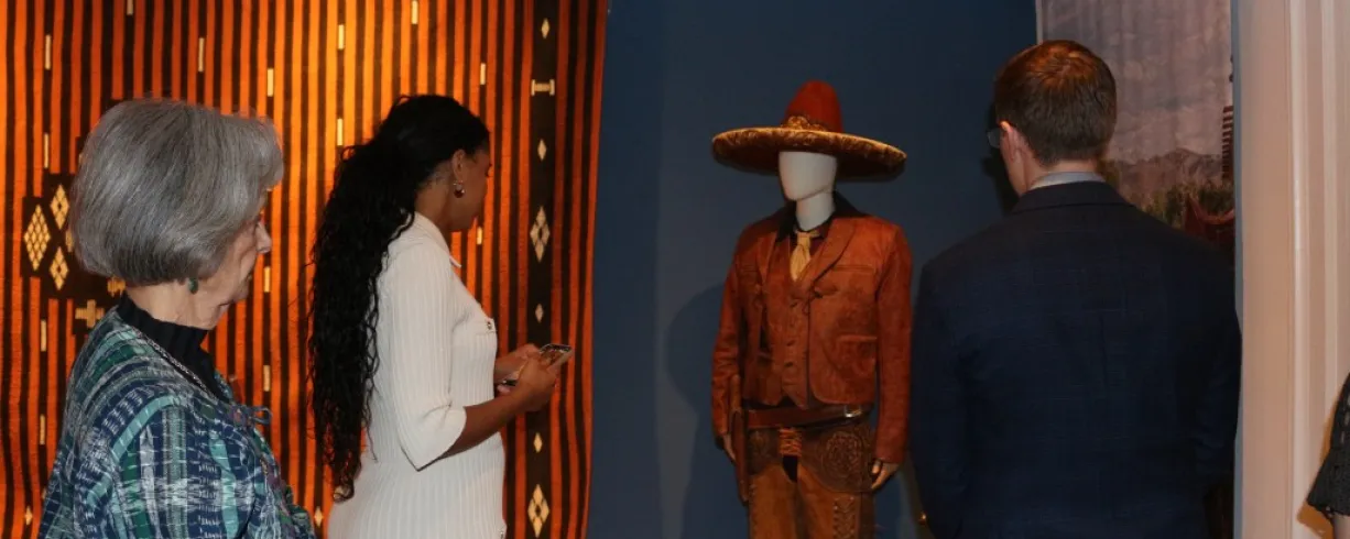 The exhibition includes original garments worn during the filming, highlighting the work of Terrazas, whose designs translate the essence of each character into textiles and color palettes that evoke identity.