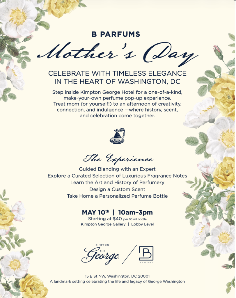 Celebrate with a Mothers Day Fragrance Creation Experiencea gift and memory in one. Join B Parfums at the Kimpton George Hotel in Washington, DC on Sunday, May 10th from 10 a.m. 3 p.m. Instead of buying perfume this year, come create your owntogether.