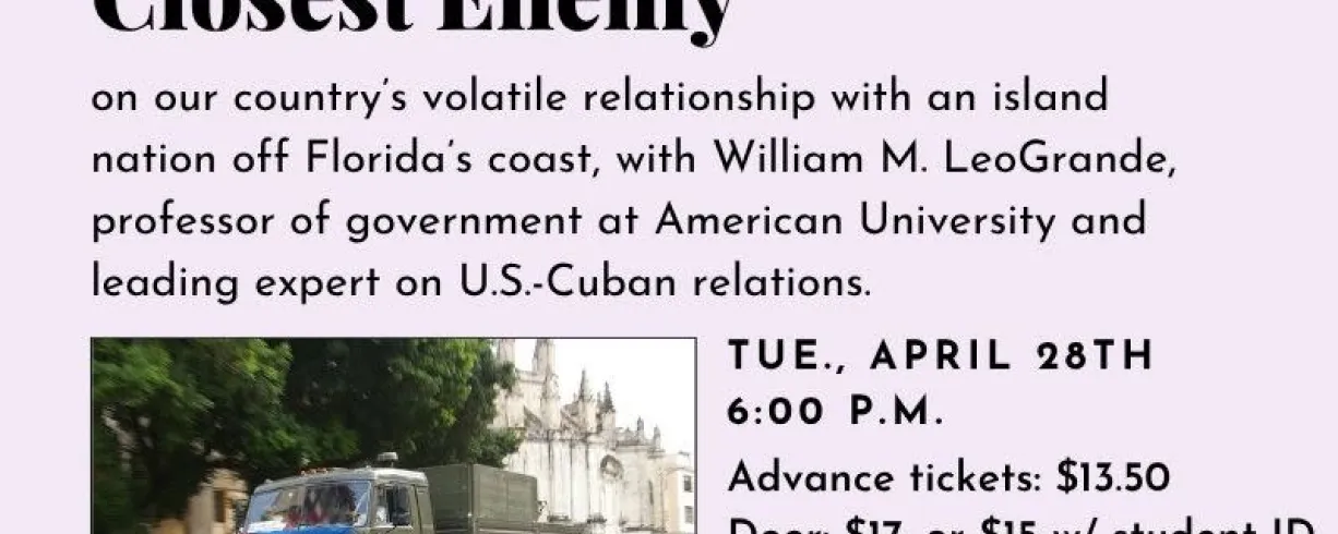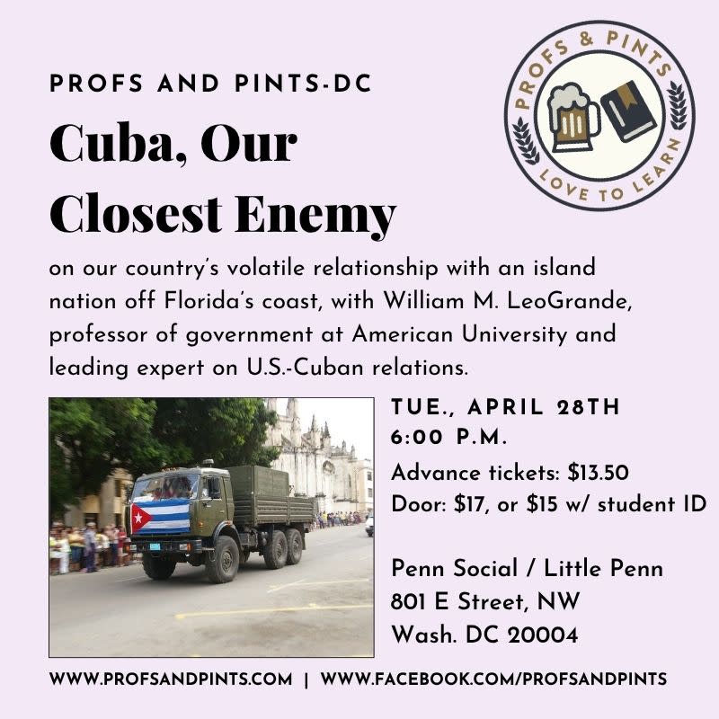 Profs and Pints DC presents: Cuba, Our Closest Enemy, on our countrys volatile relationship with an island nation off Floridas coast, with William M. LeoGrande, professor of government at American University and leading expert on U.S.-Cuban relations.