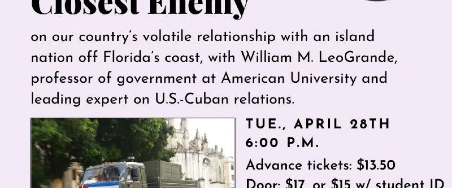 Since Fidel Castro left center stage in 2006, U.S.-Cuban relations have lurched back and forth at stomach-churning velocity. Professor LeoGrande, who has advised Congress on Cuba as a member of its foreign policy staff, will explore the stories behind the headlines. Youll learn how changes from Republican to Democratic presidents produced radical swings in relations between Washington and Havana, most dramatically between President Barack Obamas attempt to normalize relations and Donald Trumps threats to bankrupt or invade the island. (Advance tickets: $13.50 plus sales tax and processing fees. Doors: $17, or $15 with a student ID. Listed time is for doors. Talk starts 30 minutes later.)