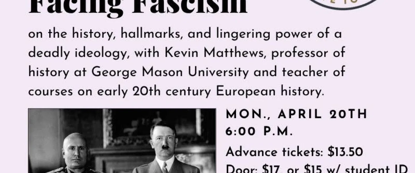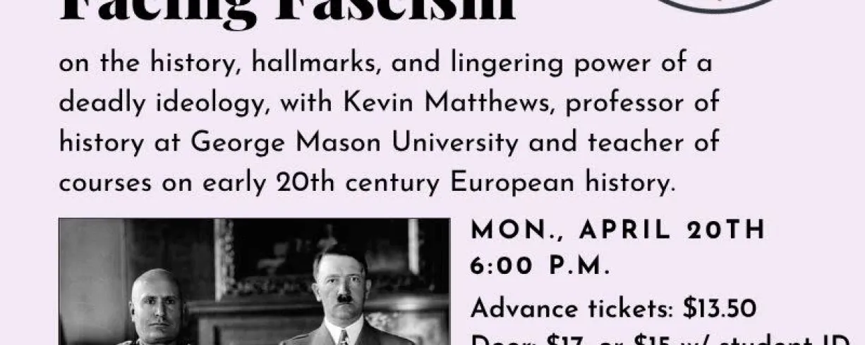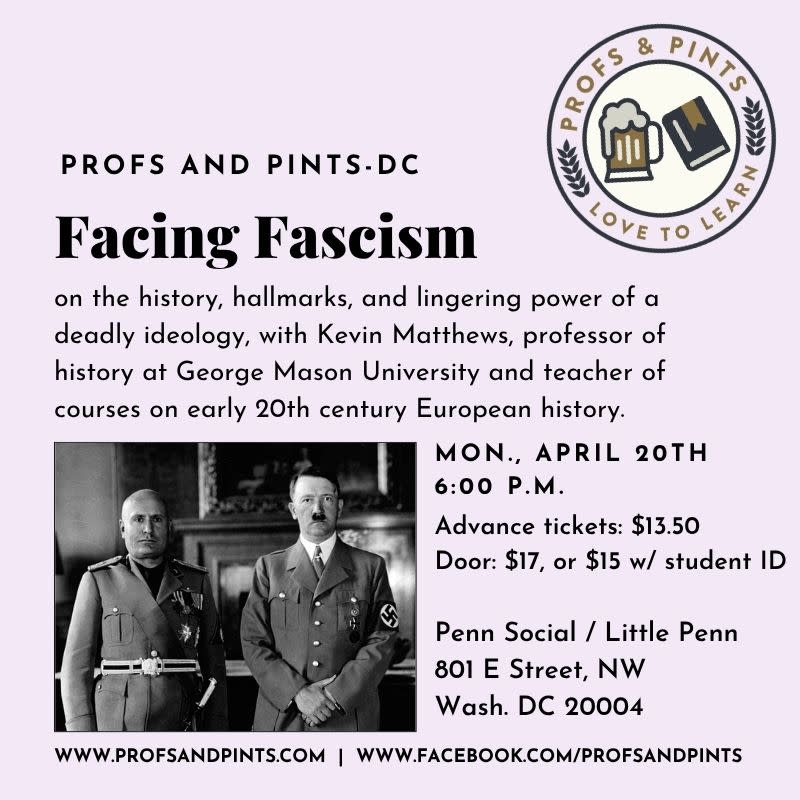 Profs and Pints DC presents: Facing Fascism, on the history, hallmarks, and lingering power of a deadly ideology, with Kevin Matthews, professor of history at George Mason University and teacher of courses on early 20th century European history.