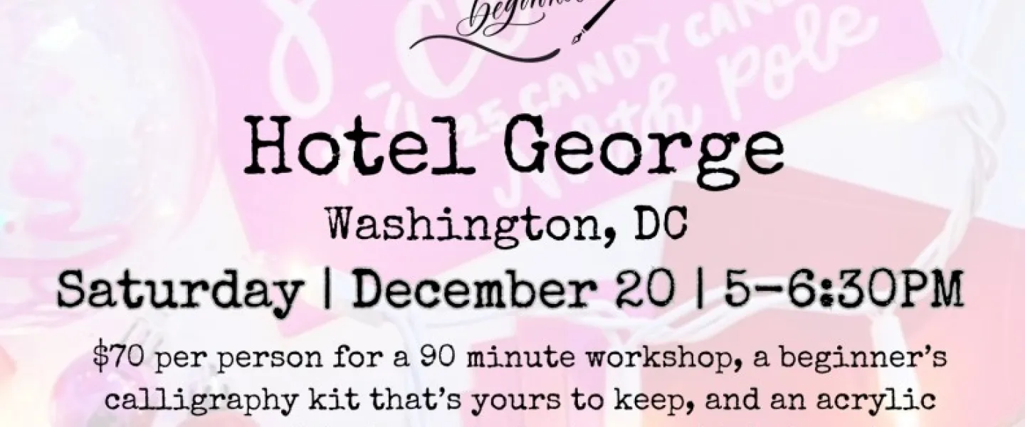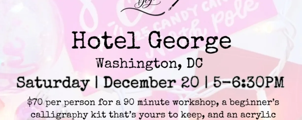 In collaboration with local small business, Sip & Script, join us at Hotel George in Washington, DC, for a festive workshop of holiday fun and pretty lettering for beginners! Whether you’re a stationery nerd, DIY Bride-to-be, or just a crafty individual, in this workshop you’ll be learning an introduction to modern calligraphy with a pointed dip pen and ink. We will cover all the basics and get you ready to add those special lettered details to all your holiday tables, Christmas trees, hostess gifts, gift tags, holiday card mailings and more! Class includes 1.5 hours of instruction and demonstration, our beginner’s calligraphy kit (two nibs, black ink pot, 2 letter guides, tracing paper and straight pen holder), and all materials to write on. Everything is yours to keep at the end of the workshop as well as a complimentary glass of wine! Additionally, we will be lettering on a take-home acrylic ornament at the end of our class time!