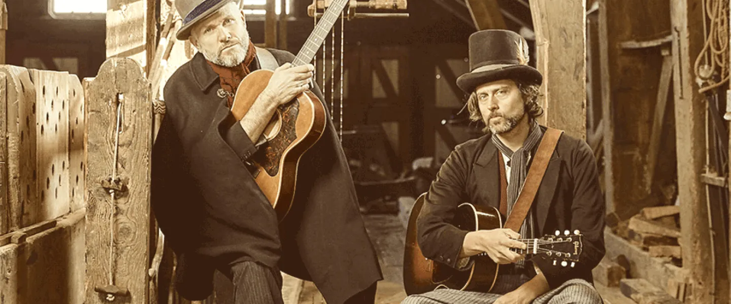 Sons of Town Hall, the transatlantic folk duo of American songwriter/author David Berkeley and British songwriter/producer Ben Parker, is creating a new genre of performance art—part live concept album, part theatrical experience. Under the aliases Josiah Chester Jones and George Ulysses Brown, Berkeley and Parker craft a mythic universe featuring two 19th-century vagabonds who travel the world in a hand-built boat, seeking adventure and love while escaping troubled pasts. Designed as a live companion experience to their radio-theater podcast Madmen Cross The Water, Sons of Town Hall weaves wild and hilarious stories into heartbreaking and rousing songs, bringing audiences along on a captivating journey.