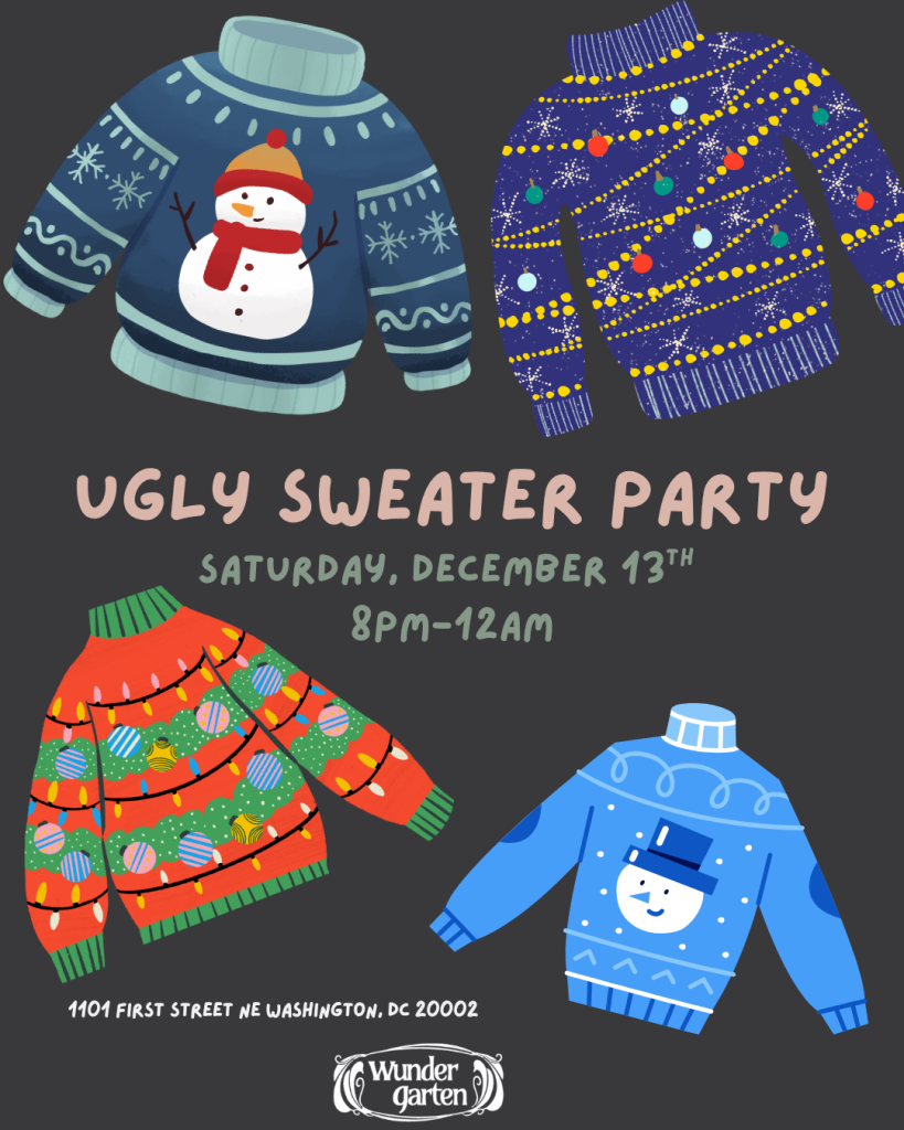 It's the most wonderful time of the year... to wear the UGLIEST sweater you own! 🎅🎄 Mark your calendars because our annual Ugly Sweater Party is back and better (worse?) than ever! We're talking tinsel, pom-poms, light-up reindeer, questionable snowmen—the tackier, the better! Bring your holiday spirit, your sense of humor, and that sweater that's been hiding in the back of your closet all year. Let's get festively ridiculous together! Who's got the ugliest sweater in DC?