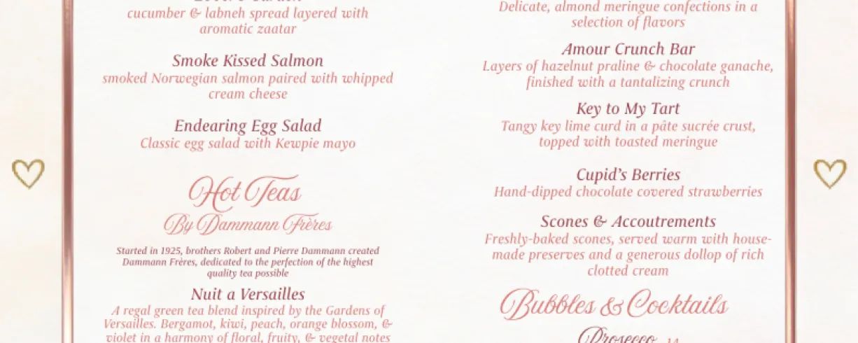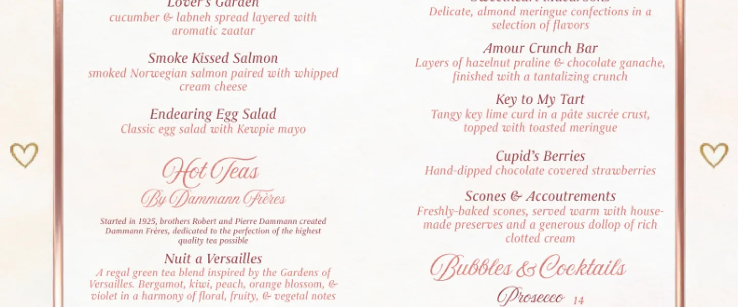 Steeped in romance and wrapped in rosy hues, our Valentine’s Day Afternoon Tea is the perfect way to linger over love. Indulge in tiered trays of delicate savories, heart‑touched pastries, and freshly baked scones, all paired with premium teas and a complimentary glass of sparkling wine to toast your favorite person. Whether it’s a first date, forever love, or a celebration with your closest friends, this charming tea service promises an intimate pause from the everyday and a sweet memory to savor long after the last sip. $60 per adult, $30 per child under 12. For large groups, contact Restaurant.managers@TheDarcyHotel.com for a tailored experience. To book: OpenTable - Choose a time for your experience
