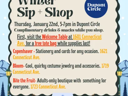 Several retail businesses along Connecticut Avenue in Dupont Circle give out free wine, non-alc cider, and snacks as you shop.