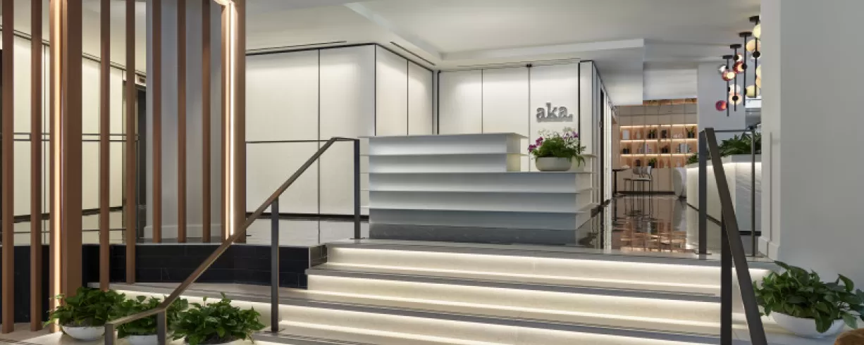 Hotel AKA Washington Circle offers a sophisticated stay in the vibrant Foggy Bottom/West End neighborhood in downtown Washington, DC. Conveniently located directly across from the Foggy Bottom Metro station, this boutique hotel features luxury accommodations perfect for both short and long-term stays, including contemporary guestrooms and spacious one-bedroom suites, many with terraces and full kitchens or kitchenettes.