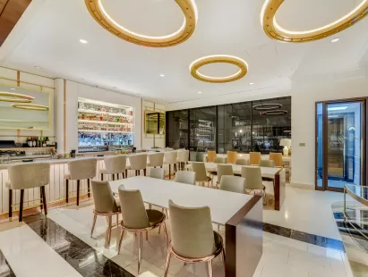 A lively and trendy lobby bar with dining space, in the heart of downtown dc, specializing in gin and bourbon cocktails, vast..