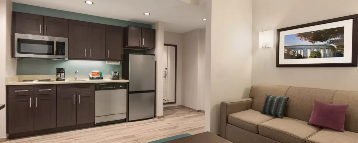 Located in the center of downtown Washington DC, a few blocks from the Convention Center, Metro, and entertainment, the Homewood Suites by Hilton Washington DC Convention Center hotel is perfect for all extended stay, business, convention and leisure visits. Across the street is a 24 hour Safeway grocery store, a number of restaurants from inexpensive fast food to gourmet restaurants. Chinatown is only 5 blocks away and has a number of restaurants to offer as well as the Verizon Center where both the NBA and NHL games are played. Walk three blocks and catch the DC Circulator bus and be in Georgetown in minutes! Take the Metro straight to L’Enfant and be a block away from the National Mall including the Air and Space Museum.