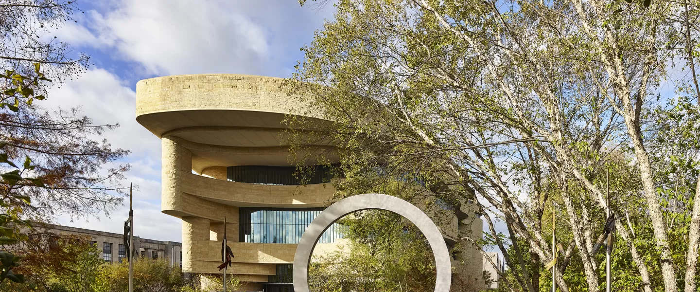 Situated near the U.S. Capitol, the National Museum of the American Indian is a striking presence on the National Mall. The building's curvilinear form evokes a wind-swept mesa. Additional features such as the museum's east-facing entrance, prism window, and 120-foot-high Potomac atrium spaces are further expressions of Native sensibilities.