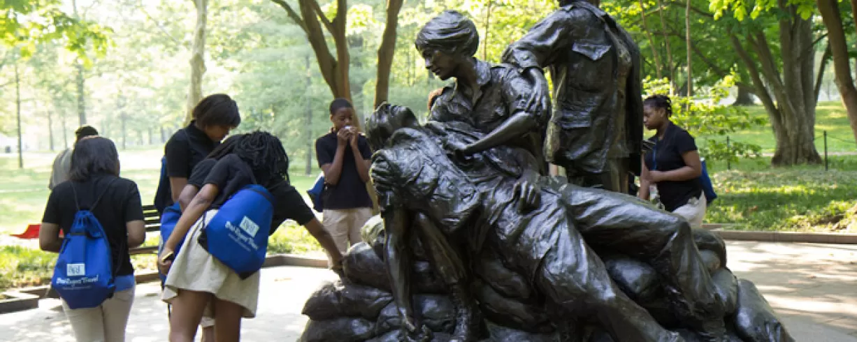 Just south of the Vietnam Veterans Memorial Wall is the Vietnam Women's Memorial, which commemorates the 265,000 military and civilian women that served during the Vietnam War, 11,000 of whom worked as nurses. The 2,000 pound bronze structure stands 15 feet tall and depicts three women attending to a wounded soldier, reflecting the unity required during the conflict.