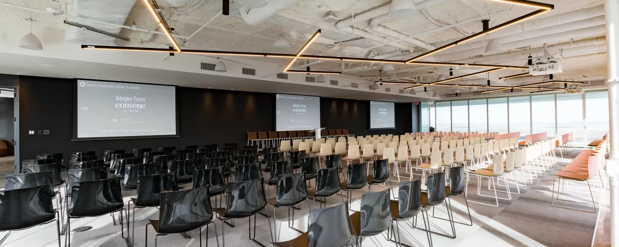 Convene, at 1201 Wilson Boulevard, is located in the tallest tower in the Metropolitan area with unique views of the DC, Maryland and Virginia skylines. This multi-level Convene location has 34,000 square feet of event space, can host up to 300 people and is purpose-built with human-centered design and state-of-the art technology.