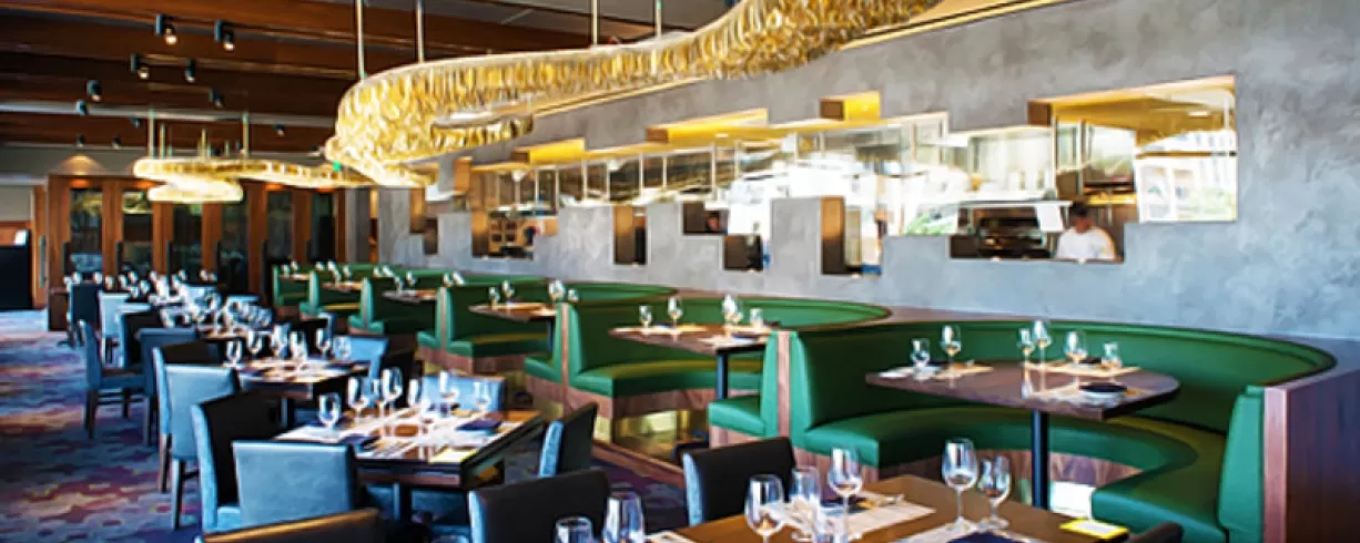 Two split-level dining rooms are bathed in sunlight during the day, and offer and abundance of energy at night, achieved through floor to ceiling windows and a natural, earthy color palette. Wine storage in modern back-lit wall cut outs, and the invigorating lights of the surrounding city give the restaurant a vitality that makes it a perfect spot for lunch or dinner any day of the week. Far from stuffy, the melodic beats of Motown and remixed jazz standards provide the backdrop for a cool, sophisticated meal with friends, family, or colleagues.