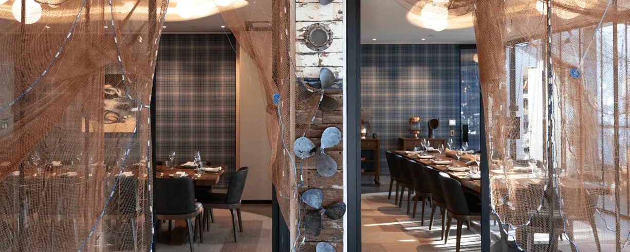 We have three private dining rooms to choose from. The smaller, interconnected Ballater Rooms can be reserved individually (seating 12 guests each) or combined to host up to 26 guests. Featuring glass paneling, repurposed fishing-net curtains, tartan-accented walls, and views of the boats on the Potomac, these rooms bring charm and character to every gathering.