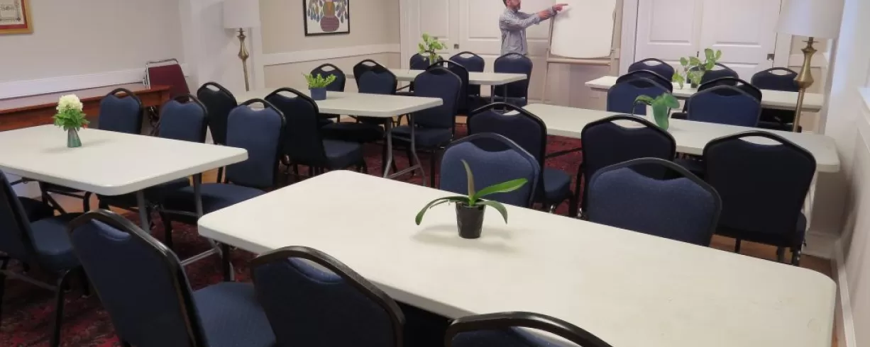Our historic spaces are also perfect for receptions, dinners, fundraisers, classes, speakers, and other events. The enclosed gardens also offer a beautiful setting for breaks, outdoor sessions and receptions. Because our spaces do not include religious symbolism, all feel welcome and comfortable.
