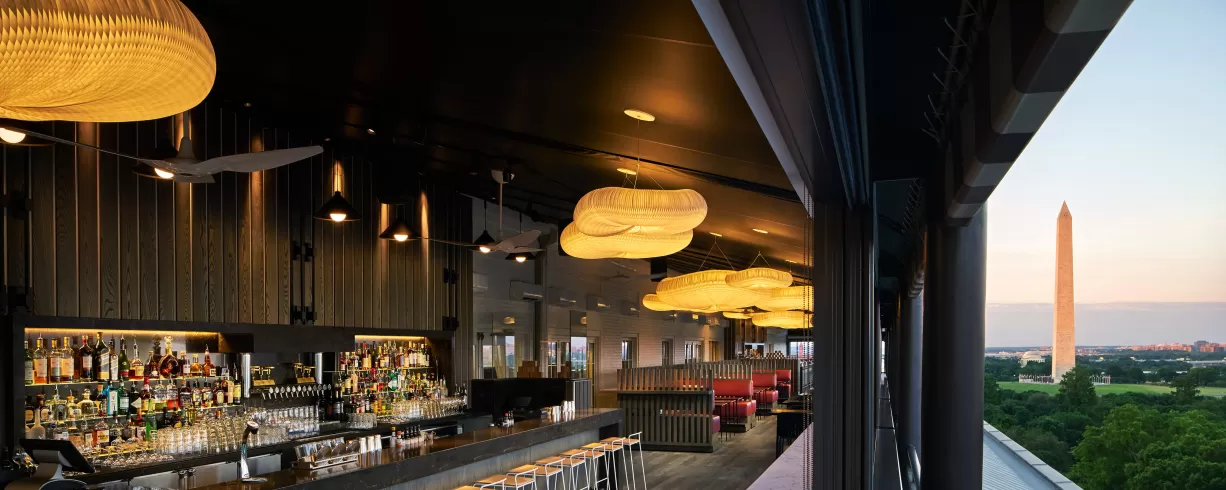 Once you're ready to see and be seen, ascend to Vue, Washington, DC's iconic rooftop lounge. Ensure you are dressed to impress, as your fashion statement is just as meaningful as your political one. Break through the red tape of DC with views of the White House normally reserved for those elected to office. Inspired by three contextual insights local to D.C., social, physical and historical, the design of Vue reflects these insights through its design details. Designed to transition from casual daytime brunches overlooking the monuments of D.C., to a hub of nightlife and cocktail culture at night, Vue features various seating zones ranging from communal tables to VIP banquettes. The space creates an intersection where the various parties of D.C. can mingle and enjoy Hotel Washington's unique programming centered on its passion points of music, fashion, design, and cocktail culture.