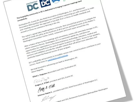 Destination DC, Events DC, the Hotel Association of Washington, D.C. and Restaurant Association Metropolitan Washington are committed to connecting you with resources to make your meeting successful. The approach is two-fold: first is a focus on health standards and second is a focus on commerce thriving in the city.