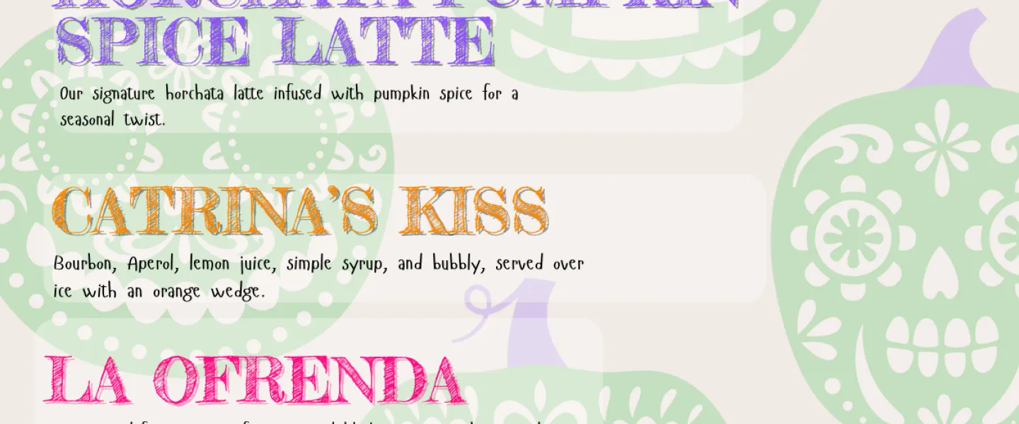 Enjoy our Ofrenda Platter filled with your favorite bites (pupusas, tamales, empanadas), sip on the Catrina’s Kiss—a smoky, spirit-forward cocktail—and end on a sweet note with our Flan del Más Allá or Horchata Pumpkin Spice Latte.