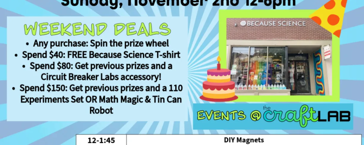 Although it’s our birthday, we’re the ones giving gifts! Throughout the weekend, we’ll have some fantastic deals: with any purchase, you can spin the prize wheel; spend $40 to receive a Because Science T-shirt; spend $80 to get previous prizes along with a Circuit Breaker Labs accessory; and if you spend $150, you’ll receive all previous prizes plus either a 110 Experiments Set or a Math Magic & Tin Can Robot!