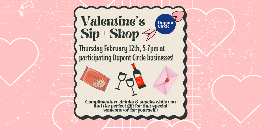 Grab some unexpected treats for yourself or friends while sipping on free wine and non-alc cider during the Dupont Circle BID's Valentine's Sip & Shop event on Thursday, February 12th from 5:00-7:00 PM! At Sip & Shop, we provide free treats and sips while you shop around the block! A perfect way to pamper yourself while you get the perfect gift for your loved ones for Valentine’s Day. Two birds with one stone!