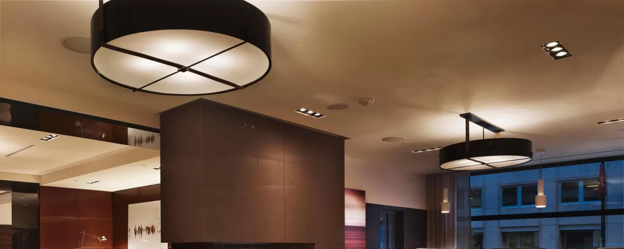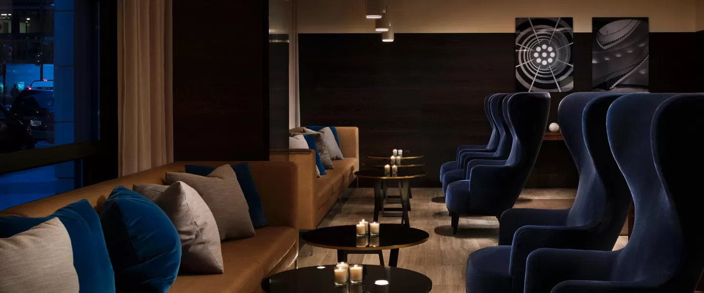 A lounge is approximately 4,000 square feet of luxurious, open flow amenity spaces, including a stunning bar and fireplace, and contemporary, comfortable seating with open views onto the street scape.