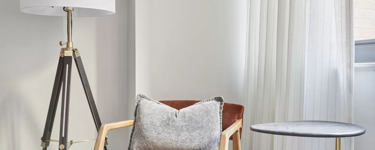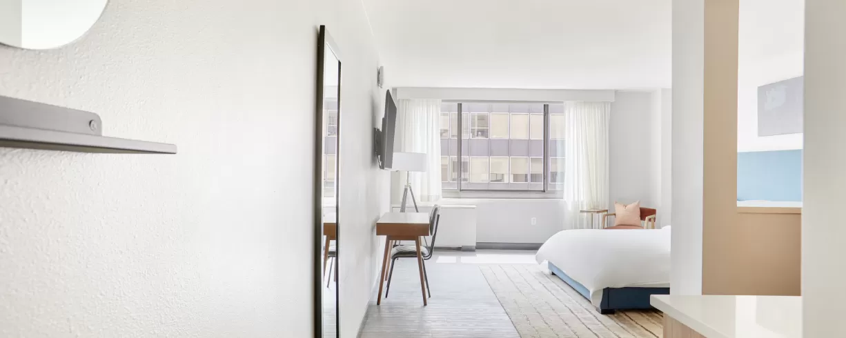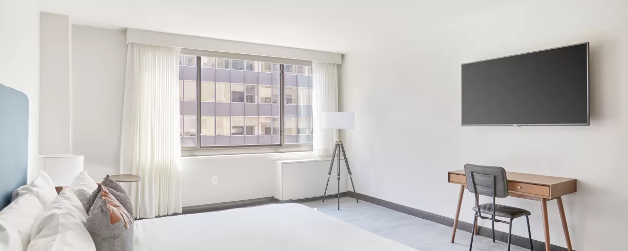 Our spacious guest rooms are your personal oasis, designed with your comfort in mind. Indulge in plush bedding, sleek furnishings and city views. Unwind in style with our exclusive amenities, including full kitchens, state-of-the-art fitness studio, daily morning coffee, smart TVs, valet parking and a meeting room that accommodates 30. Explore the city's iconic landmarks, world-class museums, and thriving arts scene with ease.