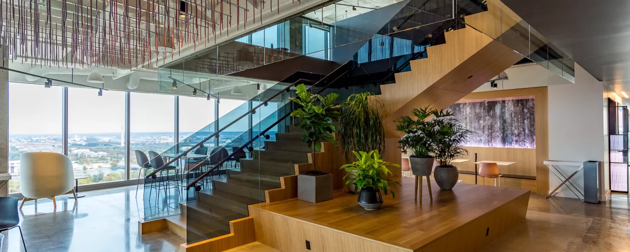 Convene, at 1201 Wilson Boulevard, is located in the tallest tower in the Metropolitan area with unique views of the DC, Maryland and Virginia skylines. This multi-level Convene location has 34,000 square feet of event space, can host up to 300 people and is purpose-built with human-centered design and state-of-the art technology.