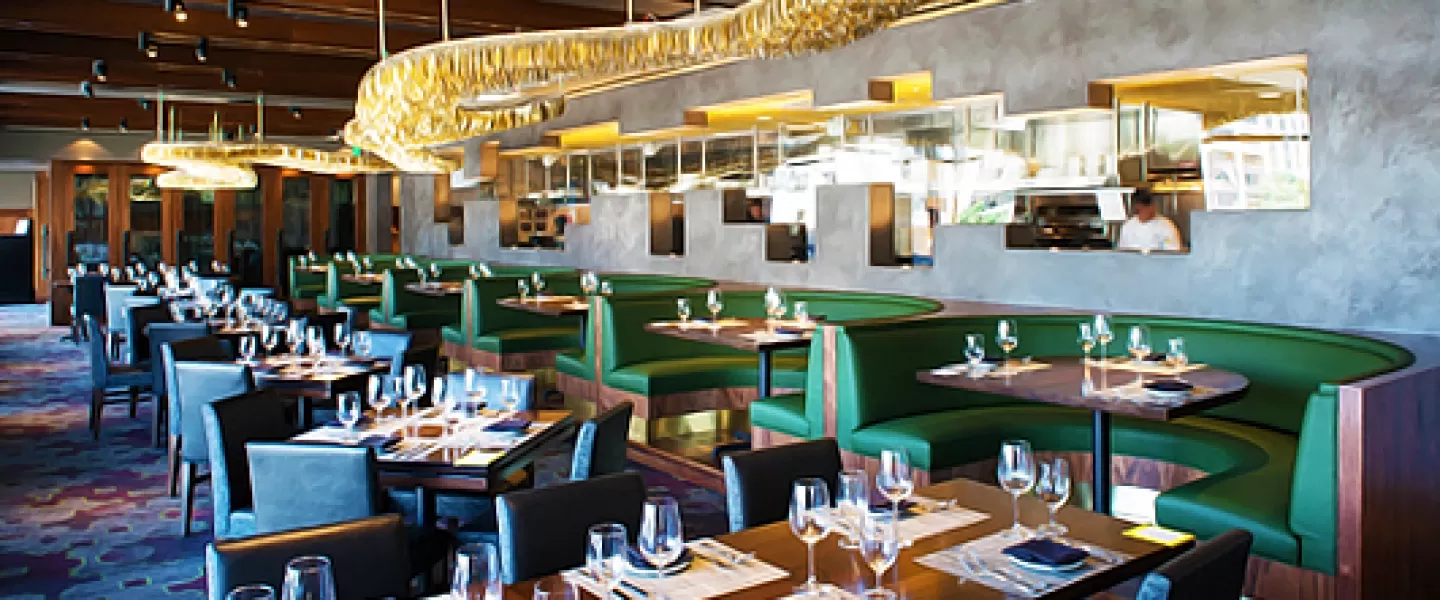 Two split-level dining rooms are bathed in sunlight during the day, and offer and abundance of energy at night, achieved through floor to ceiling windows and a natural, earthy color palette. Wine storage in modern back-lit wall cut outs, and the invigorating lights of the surrounding city give the restaurant a vitality that makes it a perfect spot for lunch or dinner any day of the week. Far from stuffy, the melodic beats of Motown and remixed jazz standards provide the backdrop for a cool, sophisticated meal with friends, family, or colleagues.
