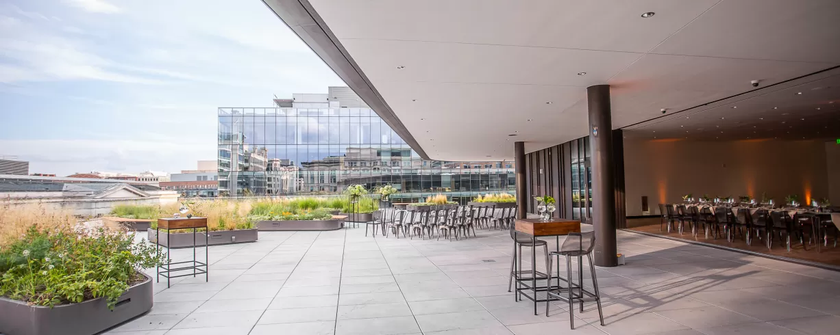 The library's 5th-floor event space and Rooftop Terrace offer breathtaking views of downtown DC. The contemporary space boasts plenty of greenery and sets the stage for a wide range of events for as many as 500, and can host up to 700 with the addition of the Auditorium pre-function space.