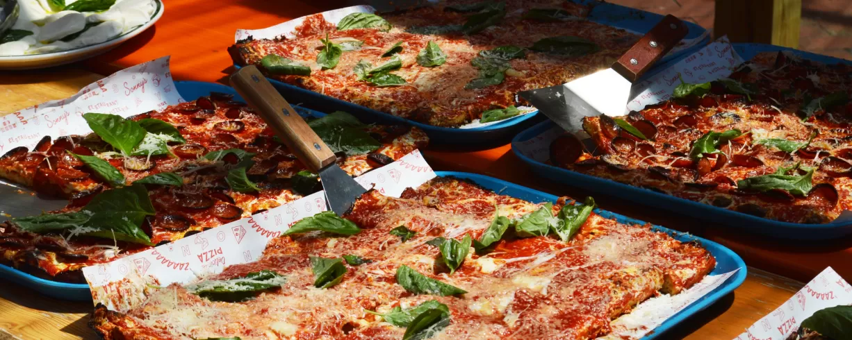All the spaces are connected by a shared patio, our “Pizza Garden”, and each offers a unique vibe while allowing you to create a personalized event when gathering for events like work happy hours, life’s milestones, blowout birthday parties, and more. Catering features our family-style pizzas and sides, elevated cocktails and spirits, a stellar natural wine bottle list and more.